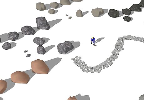 Find out what pattern you're doing. Start laying your stones. Obviously there are going to be some complicated cuts involved. Get some plastic transparent tarp that's inexpensive. Sometimes it's stuff that's usually used for masking or stuff that you'll just find around, or you can buy . Buy some Sharpie markers, too. Place the tarp around the place that you're going to cut. Be sure to stretch it out. Mark the shape of the stone you're going to cut. Write TOP in the middle of the plastic template so that you don't invert the stone. Find the appropriate stone that's the right size for the template. Put some water on your stone and place the plastic template on the watery surface so that it doesn't blow away or move. Cut the stone to the shape you need it.