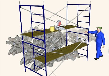 Construct a cutting operation. Usually this is done with two scaffolds and an X-brace and about three planks. Two should be at about hip level and one at the top of the scaffold, so that you can put a bucket full of water up top. This is so that you can create a siphon for your wet saw, should you need it. It's usually safe to assume you'll need it every day.