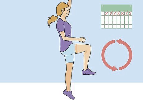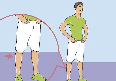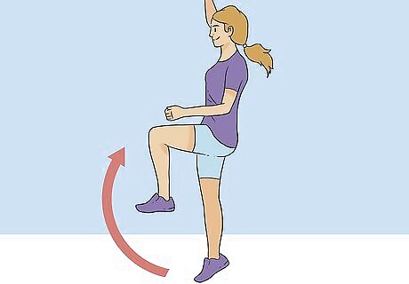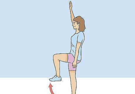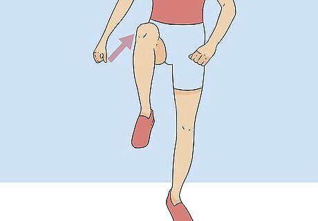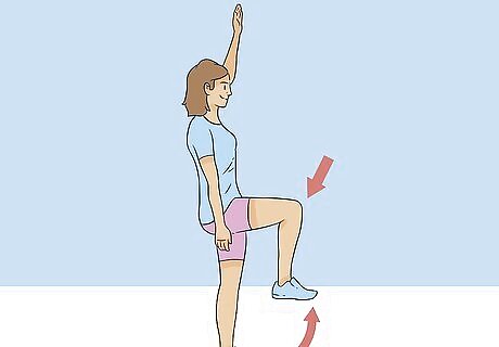 Practice with high knees. High knees help you get the last half of the touch and hop exercise. The jump and lift of your knee is similar to a high knee. To perform a high knee, stand with your feet shoulder-width apart. Lift your right knee until it is at waist level and your thigh is parallel to the floor. Lower your foot to the floor and repeat with the left leg. The higher you lift your knee so your thigh is parallel to the floor, the better. If you aren’t there yet, keep practicing and working on your flexibility. To increase the intensity, jump as you alternate between lifting each leg.