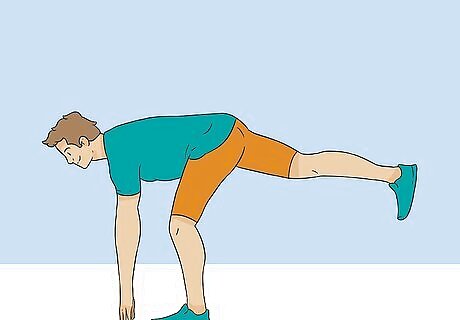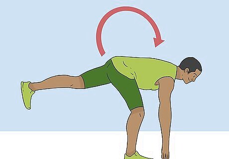 Touch the floor. With your left hand, touch the floor. Keep your core tight to help keep your balance. Make sure your leg leg stays extended behind you. Keep your back flat and don’t let it round. If you are a beginner, you may not be able to lift your leg very high. That's okay, just keep working to lift your leg higher as you improve.