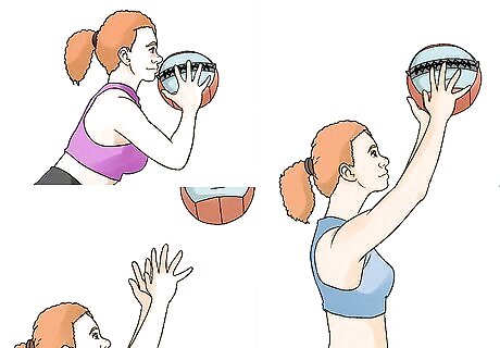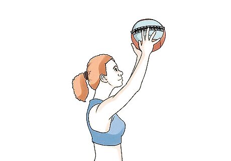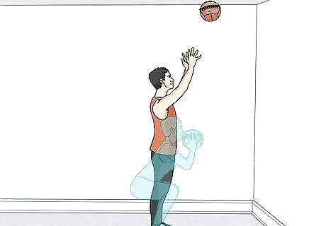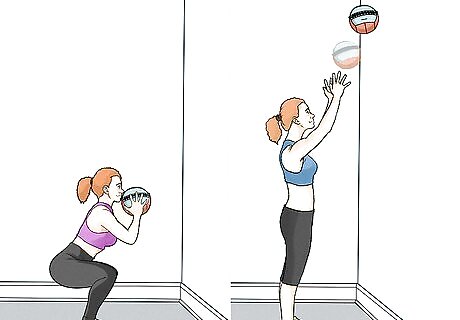 Aim the ball 8–10 ft (2.4–3.0 m) above you and throw it at the wall. Explode up from your squat and push the wall ball up in the air. Aim to hit the 8–10 ft (2.4–3.0 m) hash mark on the wall. If you aren’t in a CrossFit gym, just choose a spot above you on the wall and aim for the same spot every time. Release the ball and keep your feet underneath you. It’s okay if you jump a little bit as you’re releasing the ball. It’s also okay if you don’t jump. The goal is to hit the same spot every single time you throw the ball up, so jump if you think you need a little extra power! You should be standing nearly all the way up as you release the ball. Just bend your knees a little to maintain your balance once the ball is on its way back down.