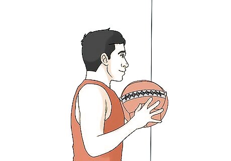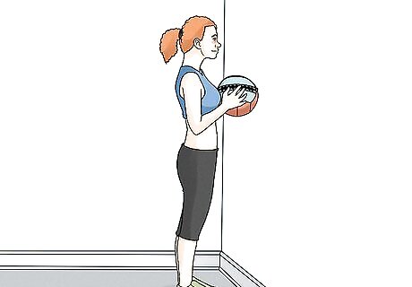 Hold the ball out from your chest and touch it against the wall. Stand in front of your wall and hold the ball out with both hands. Touch the ball barely against the wall. This is where you’ll stand for the entire exercise. If you stand too close to the wall, you’ll have to throw the ball straight up and won’t have enough room to catch it. If you stand too far away, you’re making the exercise a lot harder and you’ll need to move forward to catch the ball if you don’t throw it hard enough.