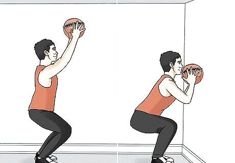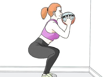 Squat with the ball under your chin and keep your shoulders back. Hold the ball by its sides with both of your hands. Spread your feet out so that they’re resting under your shoulders and go into a squat position with the ball tucked under your chin. Lower your hips so that they go just below your knees and keep your shoulders pinched back so that you’re looking up at the wall. Keep your back tilted towards the wall, not the floor. At no point in the squat should you be looking down at the ground. For every squat you do, your hips must drop below the height of your knees for it to count as a full repetition.