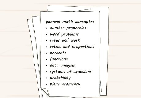 Memorize foundational math concepts. Most of the math on the GRE is simple, but many people have forgotten math basics by the time they graduate college. Go back and memorize basic algebra and geometry rules. Then study key formulas like the quadratic equation. You’ll need all of this basic knowledge for the test. Triangles are popular shapes on geometry questions. Remember formulas like the Pythagorean Theorem to find the sides of a triangle. Memorize the order of operations, PEMDAS. This acronym stands for Parentheses, Exponents, Multiplication, Division, Addition, and Subtraction. Remembering this order will help you on long equations. You probably won’t remember all of the concepts when you being prepping. Pay attention on practice tests if a concept or formula you forgot about comes up. Then review that concept after the practice test.