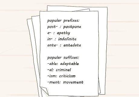 Learn the meanings for prefixes and suffixes to help with vocabulary. A prefix is a letter or phrase that begins a word, and a suffix is a letter or phrase that ends a word. Each of these can tip you off to their meanings, even if you don’t know the definition. Spend some time learning the various prefixes and suffixes to figure out questions that use words you don't know. For example, the prefix “sub“ usually means below. So you can assume “subterranean” refers to something below, even if you've never heard the word before. Some other popular prefixes are post-, a-, in-, and ante-. Some common suffixes are -able, -al, -ism, and -ment.