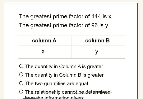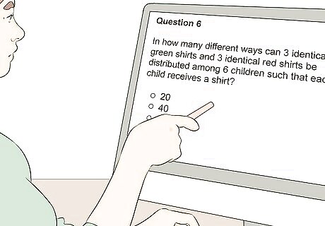 Use the process of elimination. The GRE is all multiple choice except for the essay section. That means that no matter what the question type or subject, eliminating answers will increase your chances of getting the right answer. If you don’t know an answer right away, start eliminating choices. Start with answers you know are wrong. There is probably at least one that you know doesn’t belong in the group. Cross it out to narrow your choices. Try to get a question down to 2 choices. Then if you’re still stuck, strategically guess. You have a 50% chance of picking the right answer.