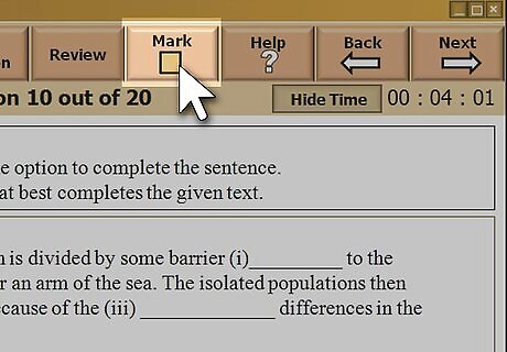 Mark questions that you want to review later. Since the GRE is a computer-based test, you’re allowed to mark questions that you want to go back to later. When you finish a section, a list of your marked questions comes up and you can go back to them. Mark all the questions you skipped, as well as questions you answered but aren’t sure about. This way you can double check your work. Prioritize going back to the questions that you skipped when you review.