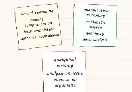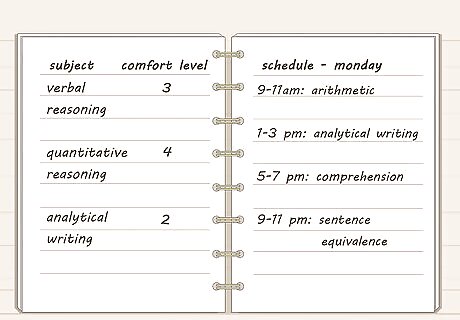 Make the most of your down time with flashcards or outside reading. Outside of your scheduled study time, many activities can help you prepare for the test. Maximize your study time by bringing books or flashcards with you to work or school. Then you can study on the bus or while you're having your lunch. Bring vocabulary or math flashcards on the bus with you to study on your commute, for example. Also read advanced writing in your down time. This will introduce you to advanced vocabulary and sentences, making the verbal and writing sections easier. Look for high-brow publications like The Economist or Foreign Affairs, or read some books that were assigned in college.
