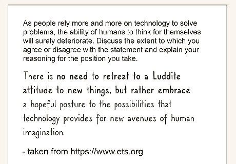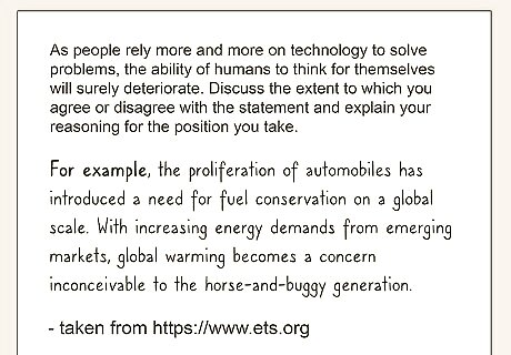 Prepare to take a stand in your essay and support it with examples. There are 2 essay types for the GRE: issue and argumentative. The issue essay presents a topic that you have to pick one side or the other on. The argumentative topic asks you to assess an argument in a reading passage. They are similar in that they both require you to take a position and defend it. Practice stating your opinions clearly. The graders don't want ambiguous answers. Look at as many past essay prompts as you can find. Questions repeat themselves every few years, so if you look at several past years, you'll notice patterns and similarities. Always support your position with details and examples. The graders know that you can't look up statistics during the test, but you can use some general facts that you learned in school. Make sure to relate any of these facts to the essay at hand. For example, an essay might ask you to oppose an argument that vaccines are harmful. You may remember that vaccines helped eradicate smallpox in the 20th century. Use that to support your argument.