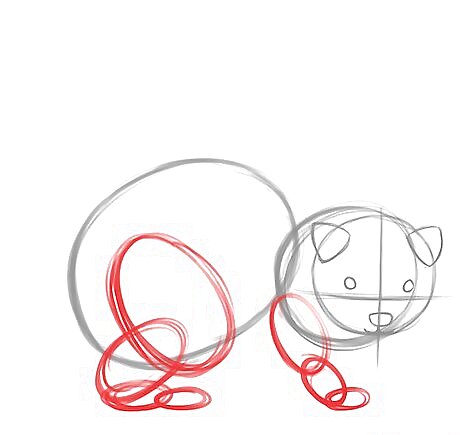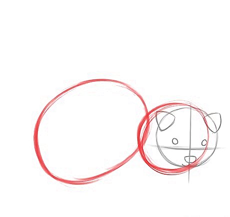 Add a small circle for the upper body and a large oval for the lower body. The upper body should overlap the head almost entirely for now. (The resulting angle will make the ferret look as though it’s turned towards you.)