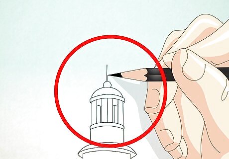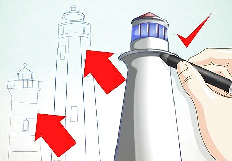 On top of the lighthouse's roof, draw a ball with an antenna. Outline the remaining lighthouse using a marker. Erase the pencil lines in preparation for coloring.