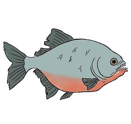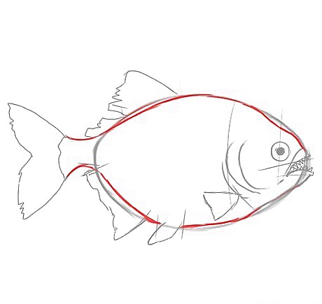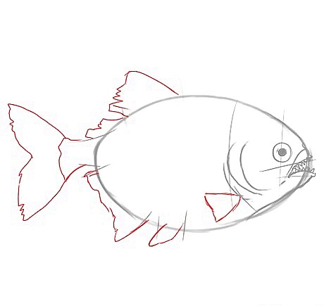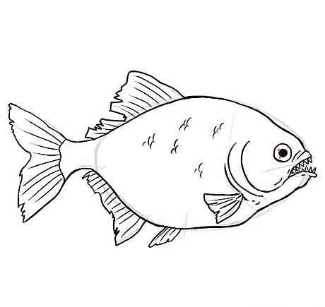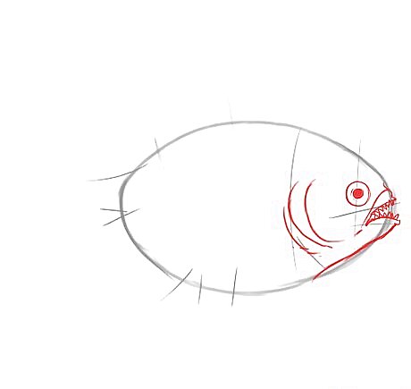 Sketch in the eyes, open mouth (with sharp, pointy teeth) and gills as well.