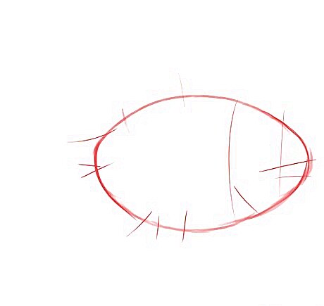Draw an oval for the body, add in guidelines, on the edge of the body.