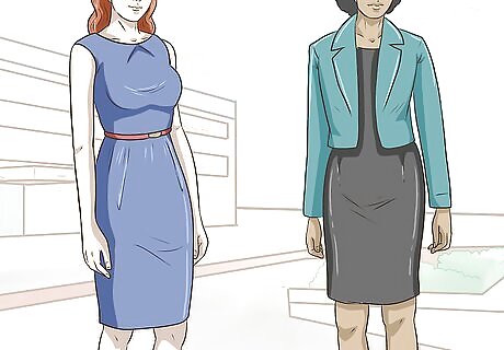 Go with a sheath dress for a timeless business look. A sheath dress can be incredibly versatile, especially when you choose one in a neutral color. You can dress it up or down by layering, making it just as perfect for a busy day full of paperwork as it is for an important meeting. Layer your sheath dress with a structured jacket, a comfortable pair of heels, and a low bun for an easy way to look put-together all day. Take your hair down, lose the jacket, and switch to a pair of strappy sandals to go from day-to-night in a snap! Sheath dresses are a great way to stay cool in hot weather, too.