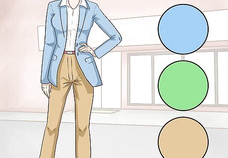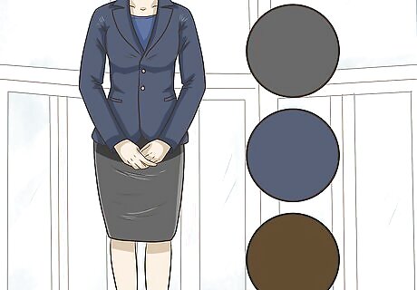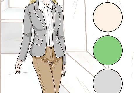 Dress in mostly neutral colors to look professional. Traditional office-wear usually consists of black, dark grey, and navy, but you can also incorporate other neutral tones into your wardrobe, including camel, cream, army green, and light blue or grey. In addition to looking more professional than bright, trendy shades, it will be easier to mix-and-match your wardrobe when you’re getting dressed each day, since many neutrals look great together. For instance, you’d be ready to take on even the toughest board meeting in a cream-colored sheath dress with a camel-colored jacket and a pair of tan pumps. It’s fine to add in a pop of color to brighten up your outfit. For instance, if you’re wearing a dark grey pencil skirt and a black blazer, you might want to wear a sleeveless fuschia top underneath the blazer to keep the outfit from being too drab.