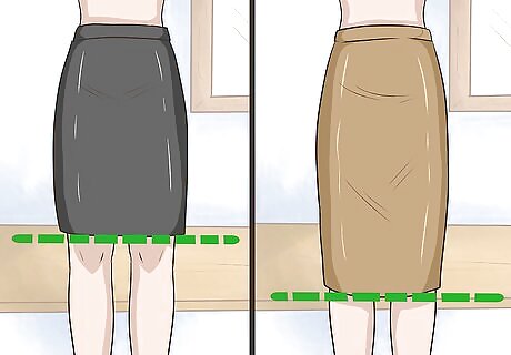 Opt for skirts that hit at, just above, or just below your knees. Knee-length skirts are the most professional-looking, and they’ll also help you avoid any embarrassing faux-pas due to showing too much skin. A skirt that hits just above the knee is very flattering for most body types, but if you’re very tall, a skirt that’s hemmed just below your knee may be a more flattering proportion for your height. Ankle-length skirts are acceptable too, but they can be difficult to style in a way that looks professional. If you want to wear one, try to pair it with pieces like a tailored button-down and stylish ankle boots.