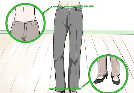 Choose pants that sit at your waist and graze the tops of your shoes. If you’re wearing pants or trousers, opt for styles that sit at the top of your waist. Also, straight-leg and boot-cut styles should cover most of the back of your shoe and should graze the top. Avoid low-rise pants, which look very informal. If you’re wearing skinny jeans, the hem should land right at your ankle. If they’re longer, they’ll bunch up at the bottom, which looks messy.