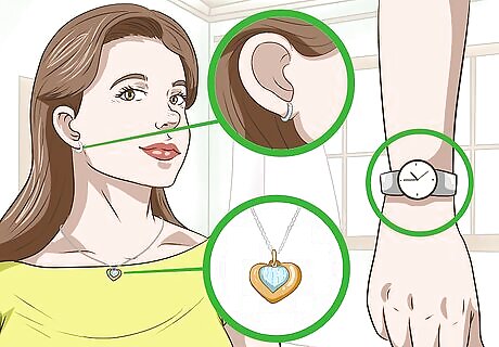Keep your jewelry minimal if you wear any. While it’s fine to accessorize, you don’t want the focus to be on your flashy jewelry. A good rule of thumb is to only wear about 3 accessories with any outfit. Also, for the most part, stick to simple, small accessories, like stud earrings or a pendant necklace. For instance, if you’re wearing a suit, you might wear a nice watch, a pair of stud earrings, and a pretty ring. Tip: If you wear a wedding ring, you do not have to include this in the number of accessories you wear.