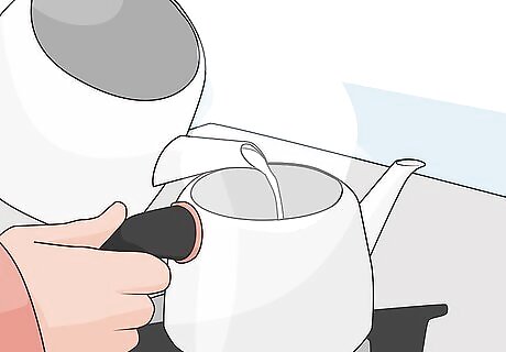Pour half of the water from the large teapot into the smaller one. It’s time to make the tea! Try to pour about half of the water from the large teapot into the smaller one to fill it up all the way. Use caution, as the water will be boiling hot.