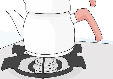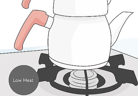 Stack the small teapot on the large teapot on the stove. The teapots are designed to sit on top of each other, which makes it convenient to heat them up. Put them both onto the stovetop at the same time so you can boil the large pot while heating up the smaller one.
