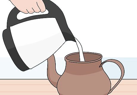 Fill the large teapot up with water. The larger teapot will fit underneath the smaller teapot. You can fill up the large pot all the way with water so that you have enough to serve to your guests. You can use bottled water or water from your tap.