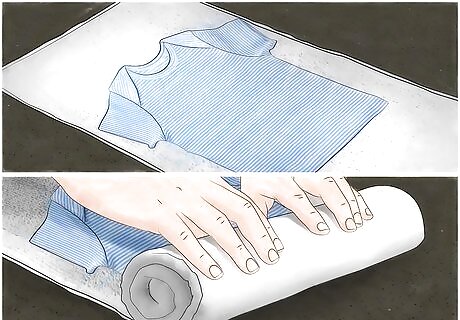 Roll your garment in the towel. Begin by placing your wet garment on the towel. Take one end of the towel, and roll it tightly with the garment inside. As you roll your garment in your towel, it should look like a log or sausage. The ends of the towel should be swirled, like a cinnamon roll.