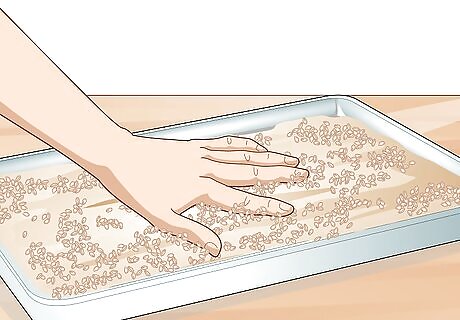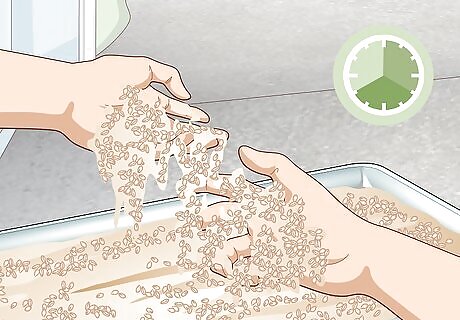 Turn the kernels over with your hands every 4 to 8 hours. In order for all of the kernels to get really dry, move them around with your hands every few hours. You don’t have to be super regulated with your timing, but you should try to do it at least 2 to 3 times per day.Tip: If you live in a super dry environment where the humidity is low, mist your barley kernels with water 2 to 3 times per day.