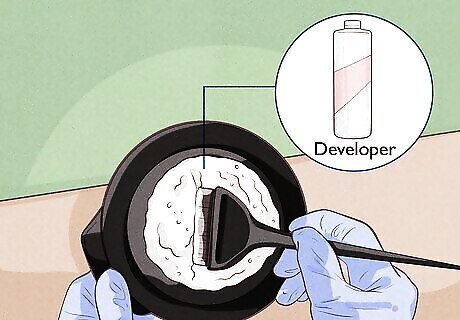 Mix your dye with a developer. This only applies to some dyes - the box your dye came in will have instructions regarding developer. The developer is generally included in the kit. If it is not, you can purchase it at your local drugstore. If you need to purchase your own developer, choose a 20% developer. Each increment of 10 represents one level change of color. For instance, a 30% developer will move your hair up three levels. If you're a sandy blonde, then you can get to a bright, sunny golden blonde with 30%, because that's a level 7 to a level 10 change.