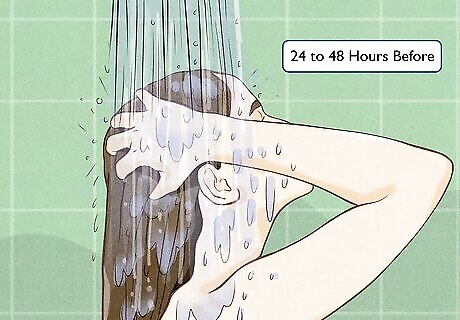 Wash your hair 24 to 48 hours before dyeing. Doing this allows the natural oils in your hair to develop which in turn allows the dye to bind to your hair more easily. The dye will blend more naturally with your hair, and that tends to make it last longer. If possible, avoid conditioner when you wash your hair the day before dyeing it. Conditioner eliminates your natural oils, which you need for the dye to set in more easily. If your hair is extremely dry, condition it every night for at least five minutes in a hot shower for a week before you plan to dye your hair. Then, do not condition your hair the night before dyeing. This will keep your hair from drying out after you dye it.