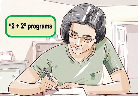 Look into “2 + 2” programs that include an associate’s degree. If having only a high school diploma is limiting your job prospects, earning a 2-year associate's degree might unlock several doors for you. So-called “2 + 2” degree programs award you an associate’s degree after 2 years, after which you can spend 2 more years completing your bachelor’s degree. “2 + 2” programs might be particularly useful if you’re a part-time student who may need a longer period of time to complete the bachelor’s degree.