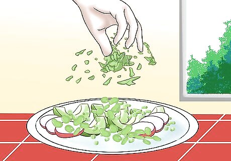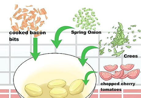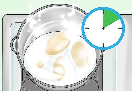 Make hard-boiled eggs. Put the eggs into a pot. Cover the eggs in an inch of cold water. Boil the water over medium-high heat and cover the pot. Once the water has been brought to a boil, remove the eggs from heat and set them aside for 8 to 10 minutes. Then, drain the water out of the pot. Hold the eggs under cold water and peel off the shells.