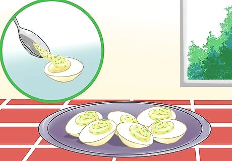Spoon the mixture into the eggs. Use a spoon to put the yolk mixture into the middle of the halved hard-boiled eggs. Spoon just enough mixture in to fill the eggs where the yolks used to be. Place the eggs on a plate and serve immediately. Cover the leftovers and store them in the refrigerator. Eat them within a few days.