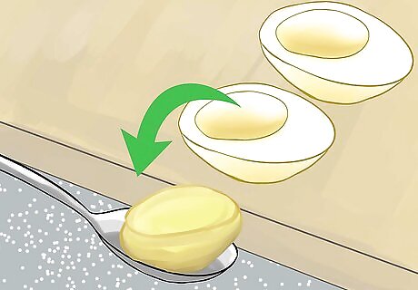 Remove the yolk. Slice the eggs in half lengthwise. Then, use a spoon or similar utensil to remove the yolk from each hard-boiled egg. Do this gently or you may break the egg. Don’t throw away the yolk. Put the yolk for each egg into a bowl.