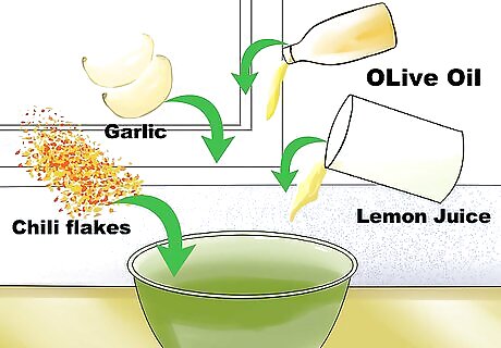 Make the dressing. Put olive oil, lemon juice, garlic, and chili flakes into a bowl. Whisk the ingredients together. Add a pinch of salt and pepper for flavor.