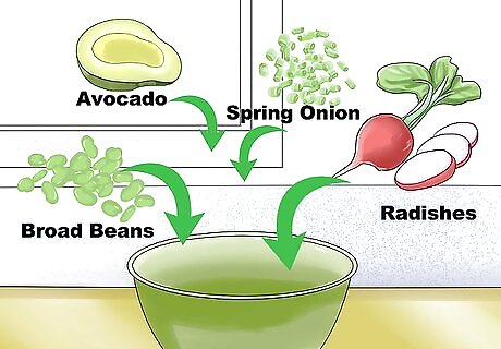 Mix wild rice, broad beans, avocado, spring onions, and radishes together. Put all of these ingredients into a bowl. Then, pour in the dressing. Toss gently until the ingredients and dressing have been thoroughly mixed together.