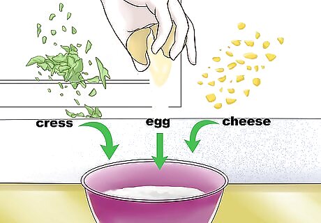 Mix the eggs, cress, and cheeses. Add the eggs, cress, and cheeses into the bowl with the baking powder mixture. Stir all of the ingredients until thoroughly combined.