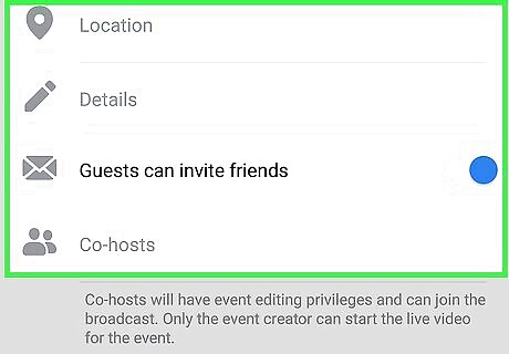 Edit the event. You can change the event photo or video (by tapping on the pencil icon in the lower right corner of the current image), name, type, format, location, and other details. Tapping through the fields, like "Co-hosts" and "Category," will prompt you for the associated information. For example, when you tap on the "Co-hosts" field, you'll see a list of your friends that you can make co-hosts. Select as many here as you like, then tap Done.