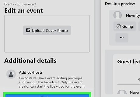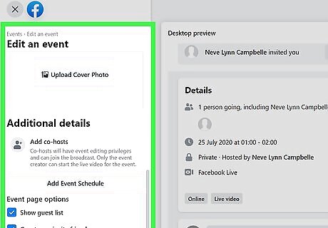 Edit the event. In the "Edit Event" window that pops up, you can change the event photo or video, name, type, format, location, and other details. Clicking through the fields will give you a prompt on how to make changes. For example, you can type a Facebook profile's name to add them as a Co-host (with the ability to make edits as well).