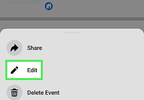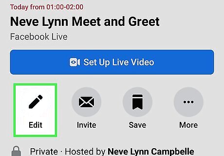 Hover your mouse over More and click Edit Event. You'll find this button to the right of the event's name. If you don't immediately see your event, scroll down to find the "Upcoming Events" header and click Edit next to your event.