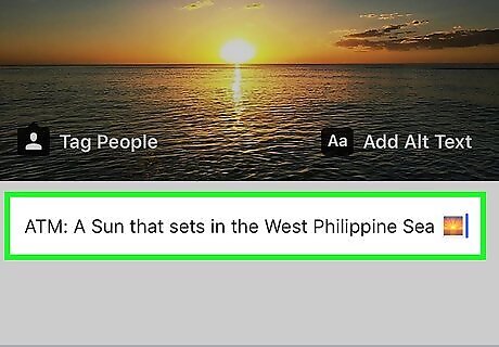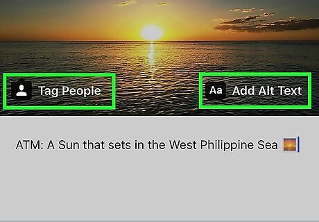 Edit other details of your post (optional). To add a location, tap Add Location at the top of the photo, then make your selection. To edit an existing location, tap it, then tap Change Location to select a new one (or Remove Location to delete it completely). To edit a tag on a photo or video, tap the tag, then tap the X to remove it. To add a tag, tap Tag People , tap the person or object on the photo, then select the user. To edit the Alt Text (the optional post descriptions for sight-impaired Instagram users), tap Edit Alt Text at the bottom-right corner of the photo, edit your descriptions as needed, then tap Done at the top-right corner.