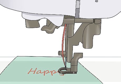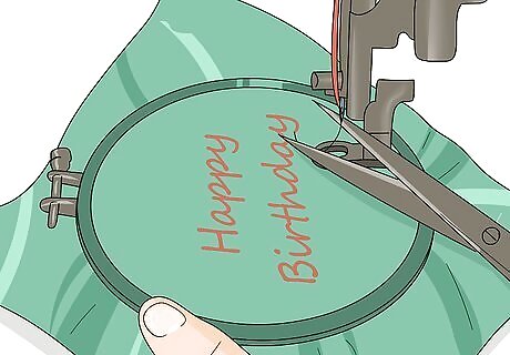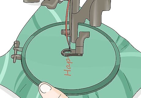 Hold the embroidery hoop as you machine stitch along the template. You'll need to hold the hoop so the first few stitches on your template are secured. Move the hoop to machine embroider the letters on your template. Begin at 1 end of a letter and stitch the outline or fill in the letter before moving on to the next letter. Remember to move the hoop instead of pulling on the fabric.