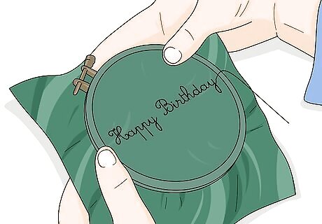 Back stitch to make cursive or printed letters. Secure your fabric between an embroidery hoop. Pull the threaded needle up from under the fabric and back down again to make a stitch as long as you like. Leave the space of 1 stitch when you bring the needle back up through the fabric. Insert the needle back at the end of the stitch you just finished. The back stitch will make a smooth, continuous letter. Continue to embroider multiple letters with the continuous piece of thread. Begin at either end of your letter. You can work the stitches in whatever direction you're most comfortable with. You can also use the back stitch to outline your letters. Decide if you'd like to leave the letters outlined or fill them in.