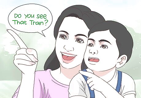 Introduce words within complete sentences. While pointing to an object and labeling it might seem like a good way to drill vocabulary words into your child’s mind, using these words in complete sentences will teach them even more. Keep your sentences short and clear but use correct grammar. Use the terms for objects in the context of relevant actions and activities to help your child expand their vocabulary and draw meaningful associations between words. Instead of saying “train” while your child is admiring a train from afar, say something like, “Do you see that train? We’re going to ride that train to the park tomorrow.” Rather than asking “drink juice?” like a toddler would, ask your child a complete question such as “Do you want to drink your juice?”