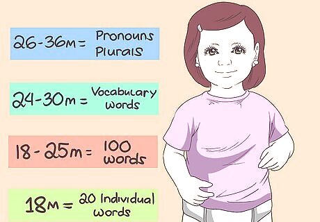 Measure your child’s progress against language development milestones. Learn about which milestones you can expect to see in your child’s speech development and when you might expect to see them. This way, you’ll know whether or not your toddler is on track. By 18 months, children will typically use at least 20 individual words along with gestures. Between 18 and 25 months, children pair words together. Their vocabulary expands to at least 100 words by 24 months. From 24 to 30 months, children start to speak in simple sentences of a few words. They also may enjoy labeling things with vocabulary words. They should be able to understand and follow simple requests and answer basic questions by this point. By 26 to 36 months, toddlers typically use pronouns and plurals. Strangers should be able to understand most of what the child is saying by this point.