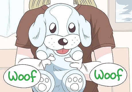 Use sound words and action words when playing with your toddler. Anytime your child is engaged in playtime, encourage them to use expressive speech by using it yourself. Say things like “zoom zoom!” for their toy car and “woof woof” for their toy dog. Be enthusiastic and make these words tempting for your child to repeat. If you practice speaking with your child during playtime, there’s a greater chance that they’ll associate talking with fun and playtime.