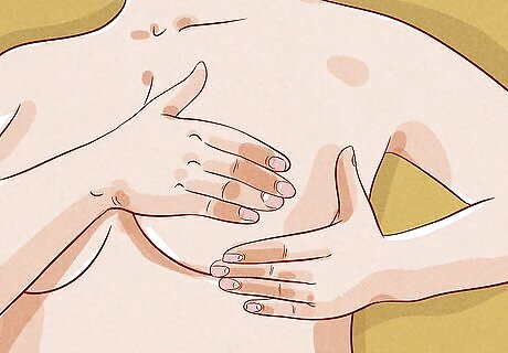 Form a C with your hand and cup your breast around the areola. Angle your hand so that it is cupping your breast. Position your fingers and thumb so they are on opposite sides of your areola (the outside of your nipple), but not touching your areola. You may not be able to cup your entire breast in your hand, especially if you have large breasts, but that is okay.