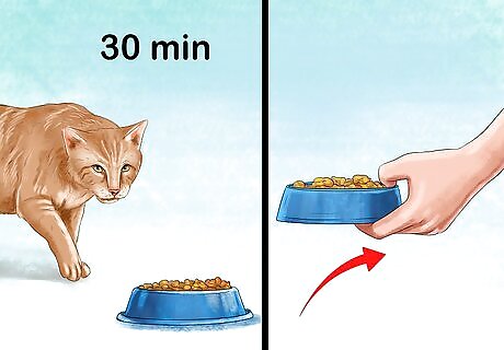 Let hunger prevail. Being really hungry can make your cat eat. At scheduled mealtimes, place the cat’s food in its favorite spot for 30 minutes. Then remove it, even if the cat hasn’t touched the food. Repeat this at the next mealtime. At some point, your cat should be too hungry to refuse its meal. Contact the vet if your cat doesn’t eat after 24 hours. This can signal a problem and cause a potentially fatal condition called fatty liver syndrome, which slows the liver’s processing of red blood cells.