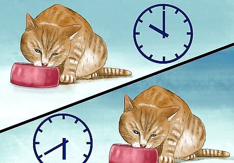 Establish an eating schedule. Most cats get hungry after twelve hours of not eating. Place your cat on a regular schedule of two meals per day. This can ensure your cat is hungry enough to not turn down food. Be patient when switching your cat to a schedule. Changing a routine can confuse them and may initially cause them to continue being fussy. Recognize that some cats (and especially kittens) may need more frequent feedings. Consult the vet when establishing your cat’s eating schedule.