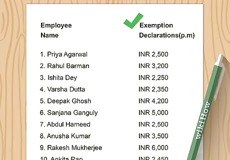 Collect exemption declarations from employees. Employees can claim a portion of their income is tax-exempt based on investments made, travel and housing allowances, or medical allowances. To be eligible for the exemption, your employees must declare the amounts in a written statement and provide proof of their expenses. Some investments also qualify for exemption. These include investments in mutual funds, National Savings Certificates, and life insurance premiums. Each employee can declare up to Rs. 1,50,000 as tax-exempt annually. It is up to you as the employer to review their declarations and proof and determine which exemptions they are eligible for.