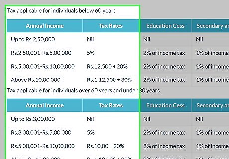 Consult rate tables to find the applicable tax rate. Generally, there are 3 tax slabs. If an employee earns Rs. 2.5 lakhs or less, their entire income is exempt. Otherwise, you will deduct a percentage of their income for taxes from each paycheck. Employees making between Rs. 2.5 lakhs and Rs. 5 lakhs are taxed at 10 percent. If they earn between Rs. 5 lakhs and Rs. 6.33 lakhs, they are taxed at 20 percent. Any greater income is taxed at 30 percent.